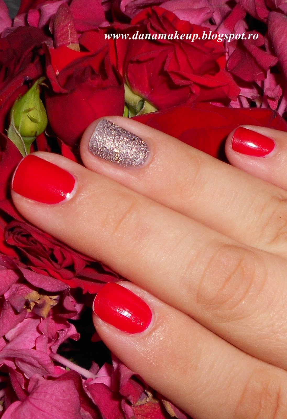 Pentru ca Sarbatorile sunt despre rosu, iar in noaptea dintre ani glitterul este cea mai buna alegere, m-am gandit sa echilibrez cumva balanta si sa incerc ceva clasic: unghii rosii si una altfel